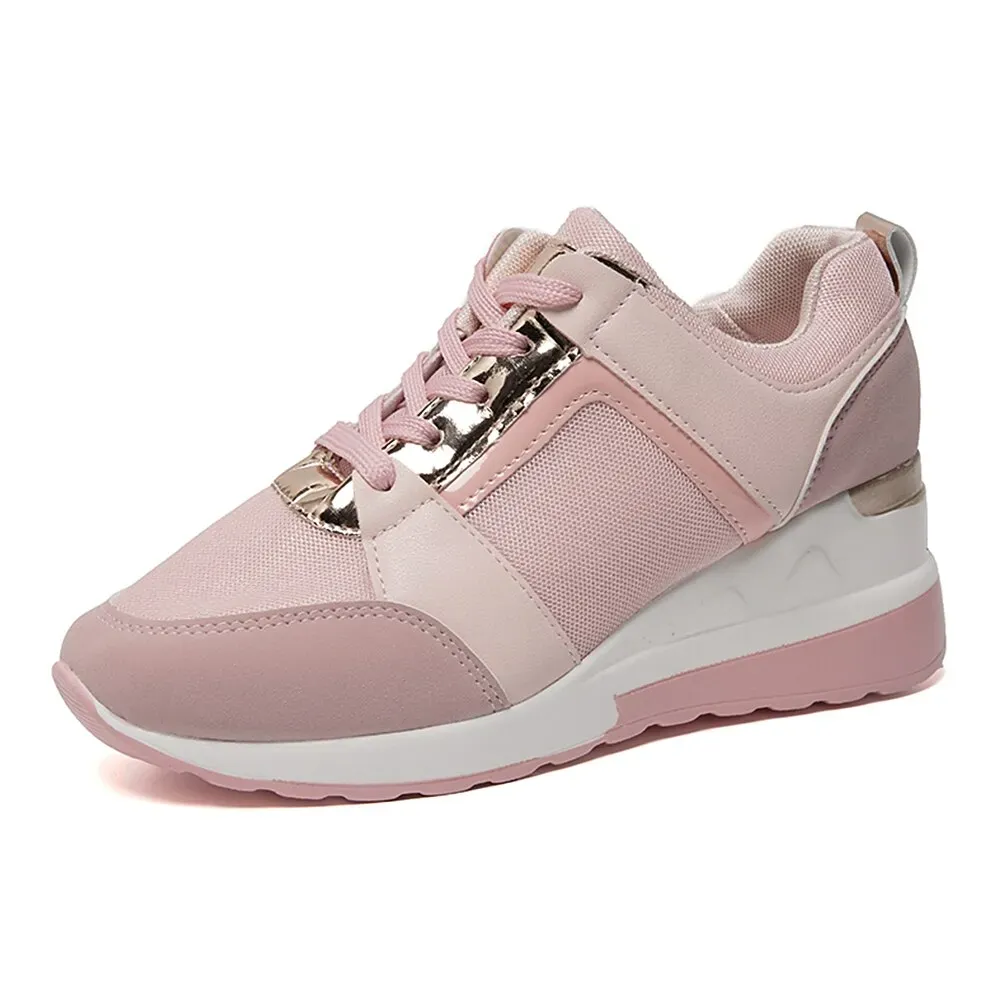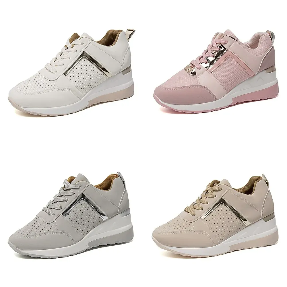 [Fabric]: Crafted from a blend of high-quality polyester and PU, these women’s sneakers are designed for breathable comfort and durability. The materials ensure effective ventilation while providing a stylish, trendy look that complements the overall design.[Fit]: Featuring a wedge heel, these sneakers subtly increase height without compromising on comfort. The padded collar and lightweight rubber sole offer excellent support and cushioning for all-day wear.[Design Highlights]: The sneakers showcase a classic round toe and lace-up closure for a secure fit. Gold metallic accents add a chic and modern touch, while the color block pattern in shades of white, light grey, and pink delivers a contemporary aesthetic.[Occasions]: Perfect for daily wear and outdoor activities, these sneakers are versatile enough to complement casual outfits such as jeans or leggings, effortlessly blending sporty and classic styles. Whether walking or playing tennis, these shoes offer both style and functionality for spring, summer, and fall.[Size Range]: Available in a wide size range from 36 to 43 EU, these sneakers are also offered in UK size 14.5, accommodating a variety of foot sizes for a perfect fit.